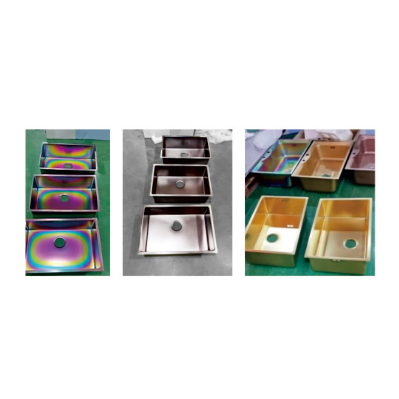 El equipo de recubrimiento especializado para fregaderos no solo es adecuado para la producción de fregaderos de cocina, sino que también se usa ampliamente en los campos de baño, hardware, piezas automotrices, productos electrónicos, etc., proporcionando soluciones de tratamiento de superficie para clientes en estas industrias. En resumen, el equipo de recubrimiento especializado para sumideros es una parte indispensable de la fabricación moderna que proporciona soluciones de tratamiento de superficie eficientes para sumideros y otros productos a través de la tecnología PVD avanzada.